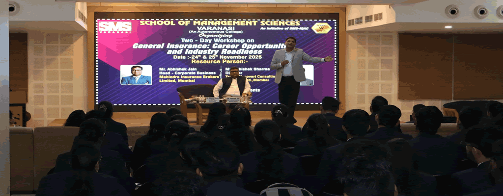 With the Objective of improving student’s personality and giving them platform to express their opinion about different topics, SMS Varanasi used to organize workshop for them. Management Practices; Recent changes in Marketing, HR and Finance areas; Soft Skills, personality development and upcoming trends in Computer Technologies are the common functional areas for such workshops. These workshops are meant for students of different Management and Computer related courses including MBA, MCA, MCOM, BBA, BCA , BCOM, BCOM(H) as well as B.A(H) Mass Comm.